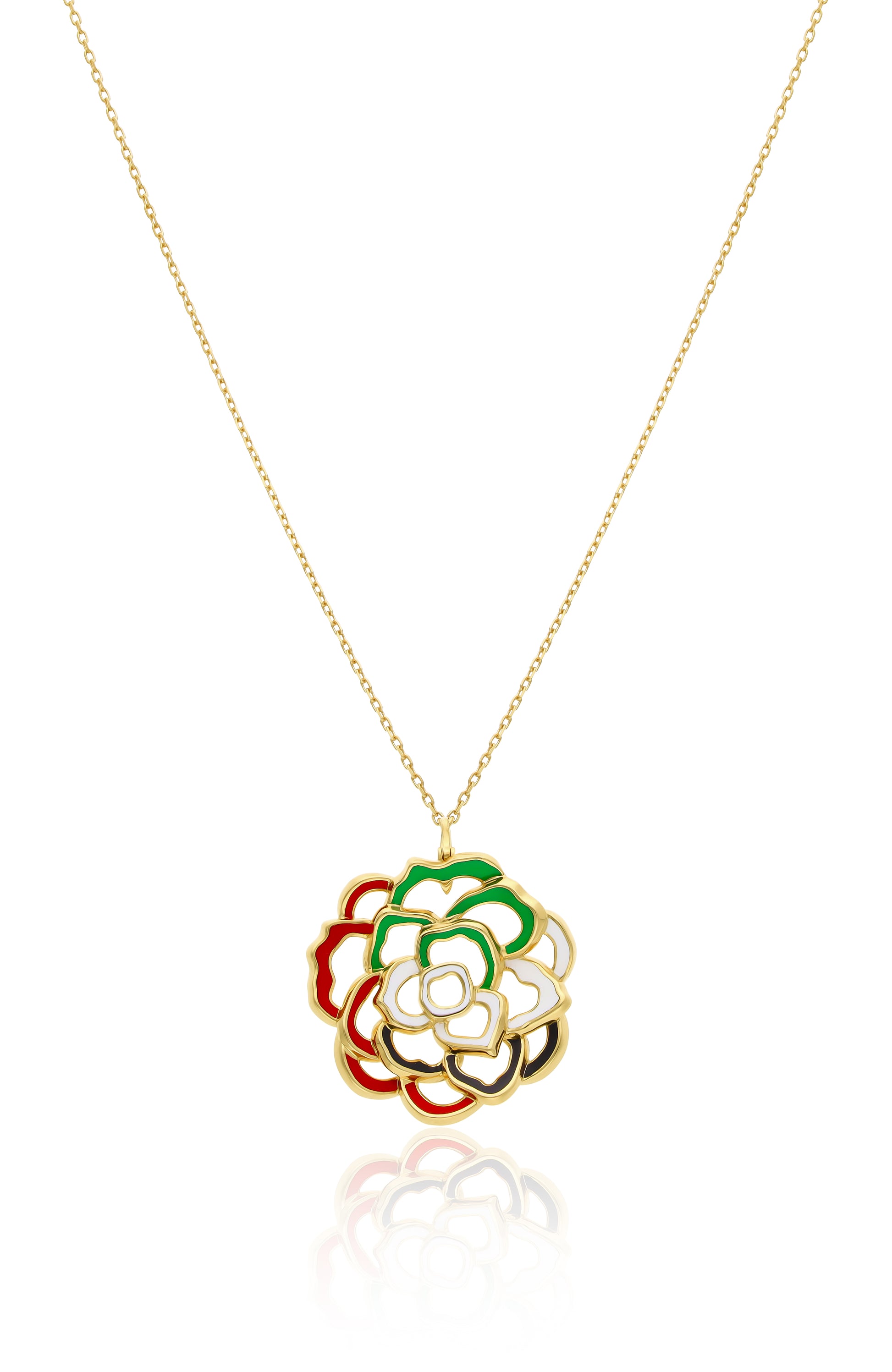 قلادة مميزة بتصميم زهرة الفاوانيا المنحوتة والمزينة بلمسات من المينا النابضة بالحياة. صُممت هذه القلادة للاحتفاء بالألوان والحرفية والأنوثة في قطعة واحدة خالدة.